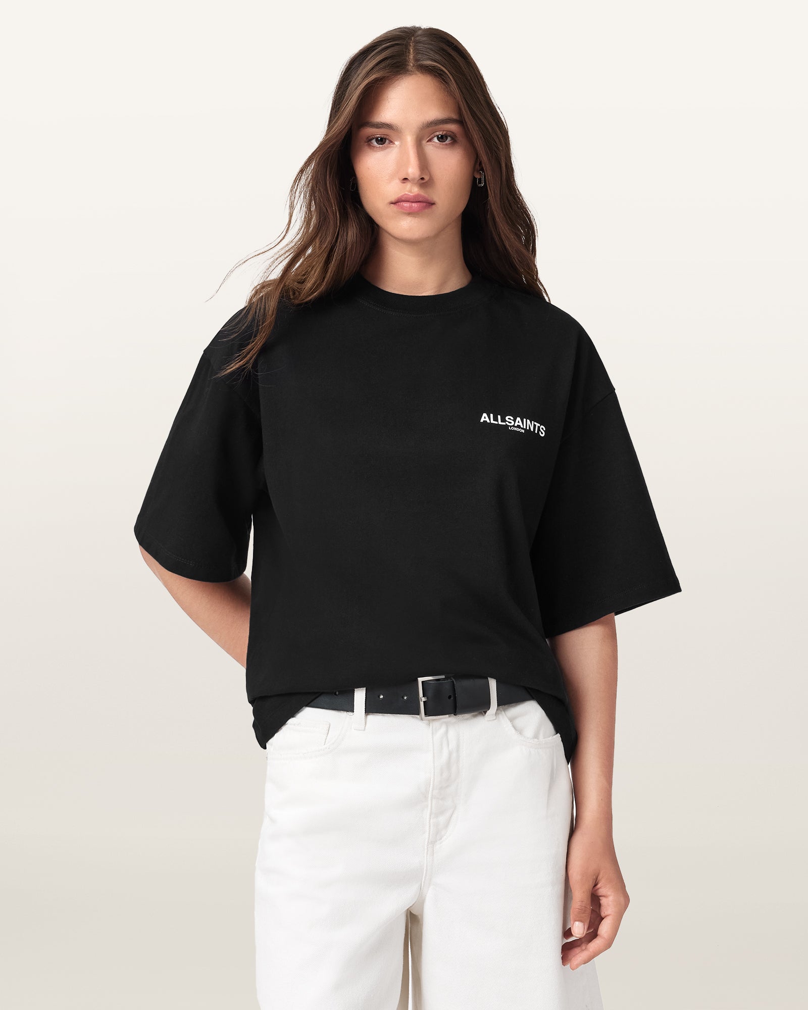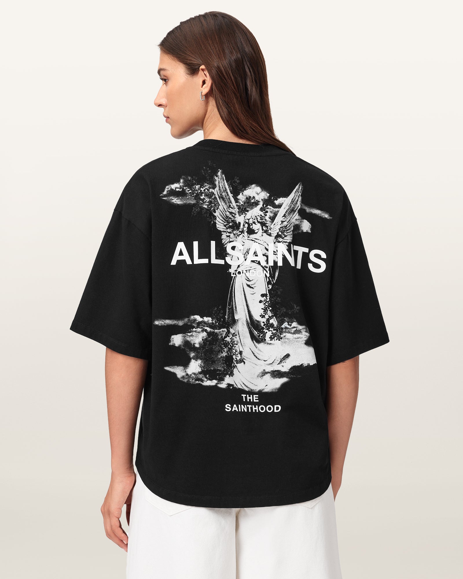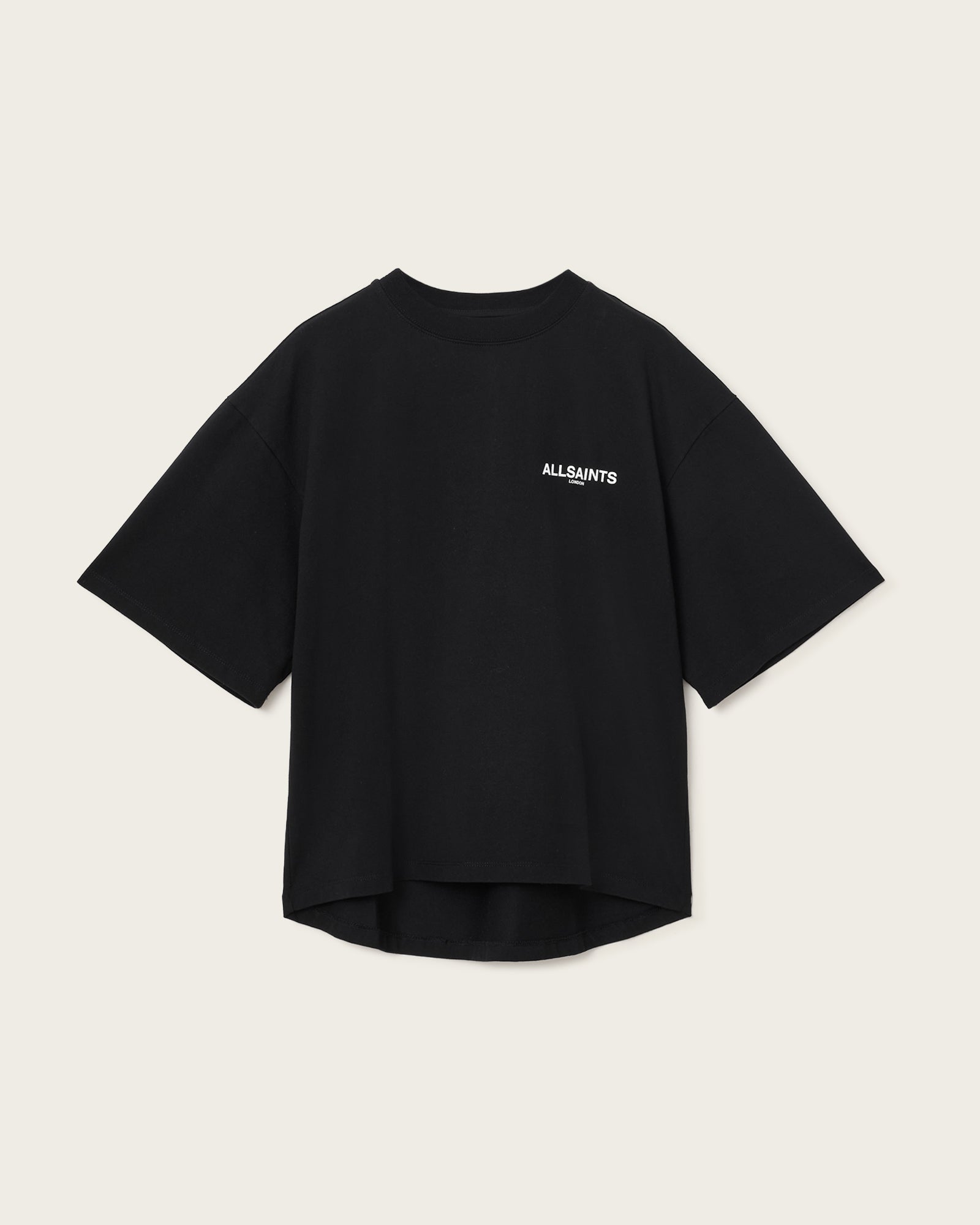 Looking for a versatile styling option? Meet the Amelie T-Shirt. Made from organic cotton, it's shaped to a classic crew-neck silhouette with dropped shoulders, creating a relaxed boxy fit. At the back there's a slight curved hem to add more dimension to the shape. Complete with our new artwork, it's bold, it's so AllSaints..
