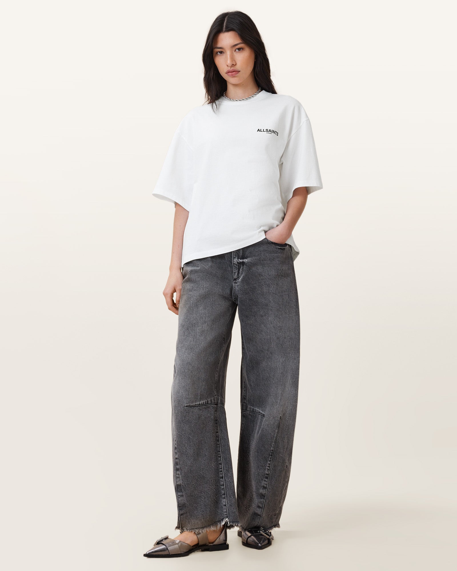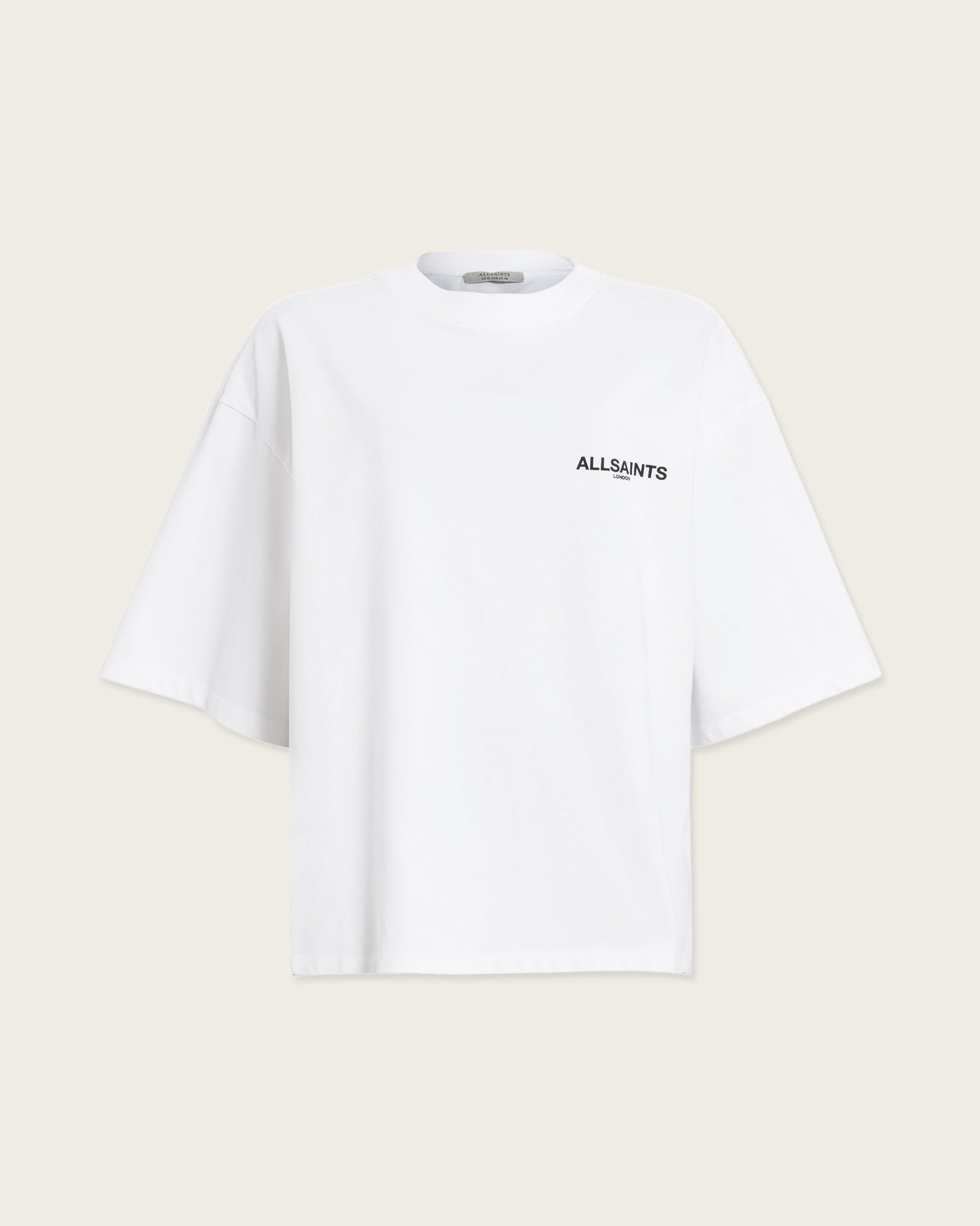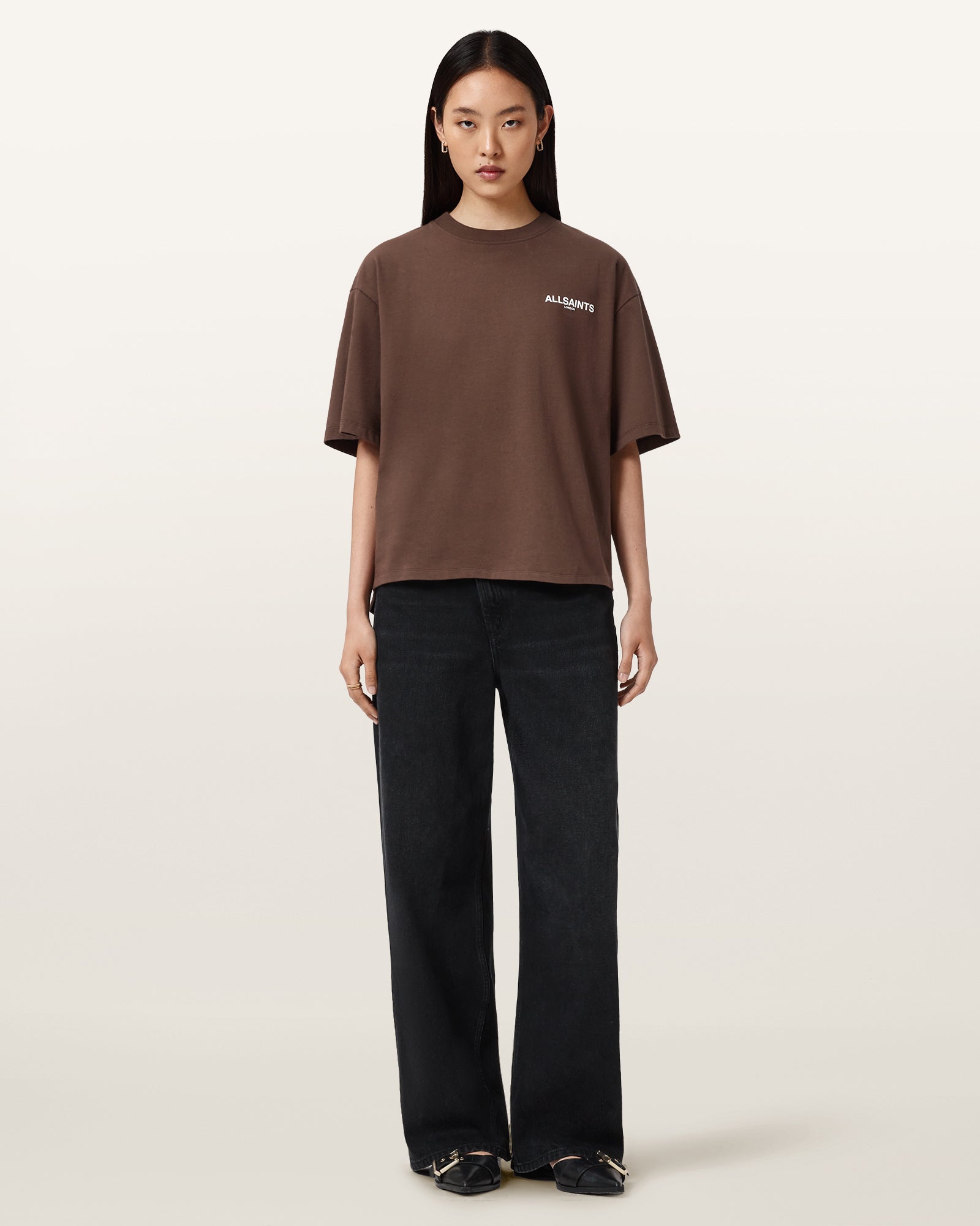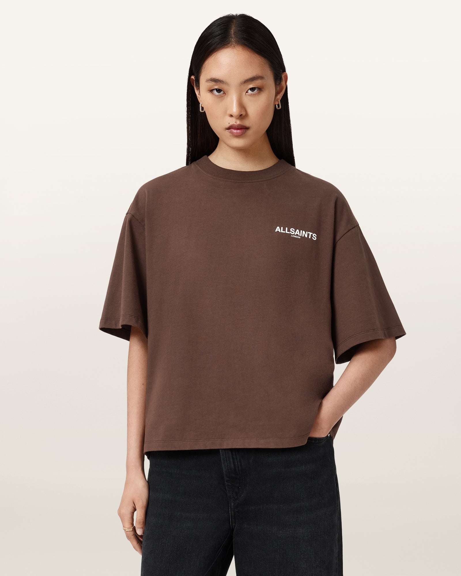 Looking for a versatile styling option? Meet the Amelie T-Shirt. Made from organic cotton, it's shaped to a classic crew-neck silhouette with dropped shoulders, creating a relaxed boxy fit. At the back there's a slight curved hem to add more dimension to the shape. Complete with our new artwork, it's bold, it's so AllSaints..